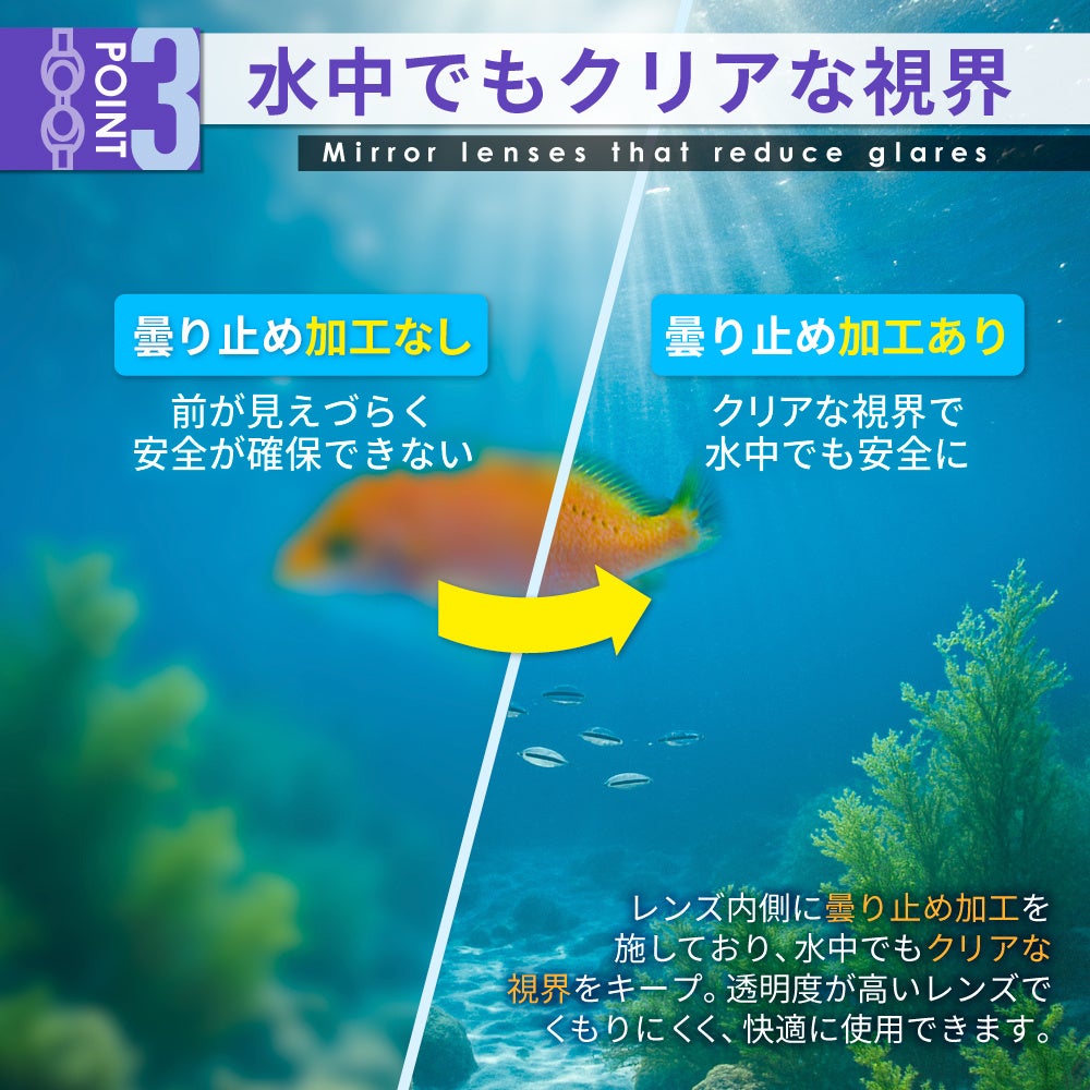 レンズの内側に施されたくもり止め加工により、水中でも高い透明度をキープ。前方が見えにくくなる心配がなく、クリアな視界を実現します。