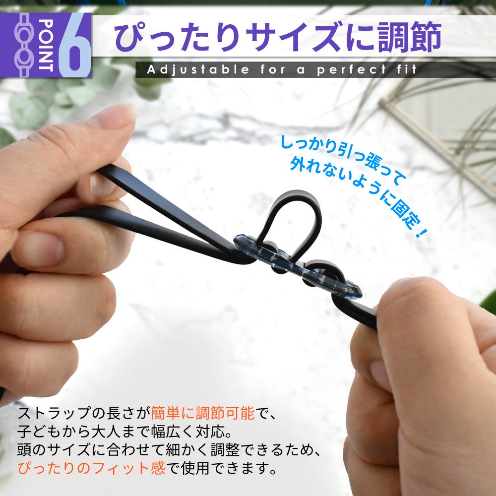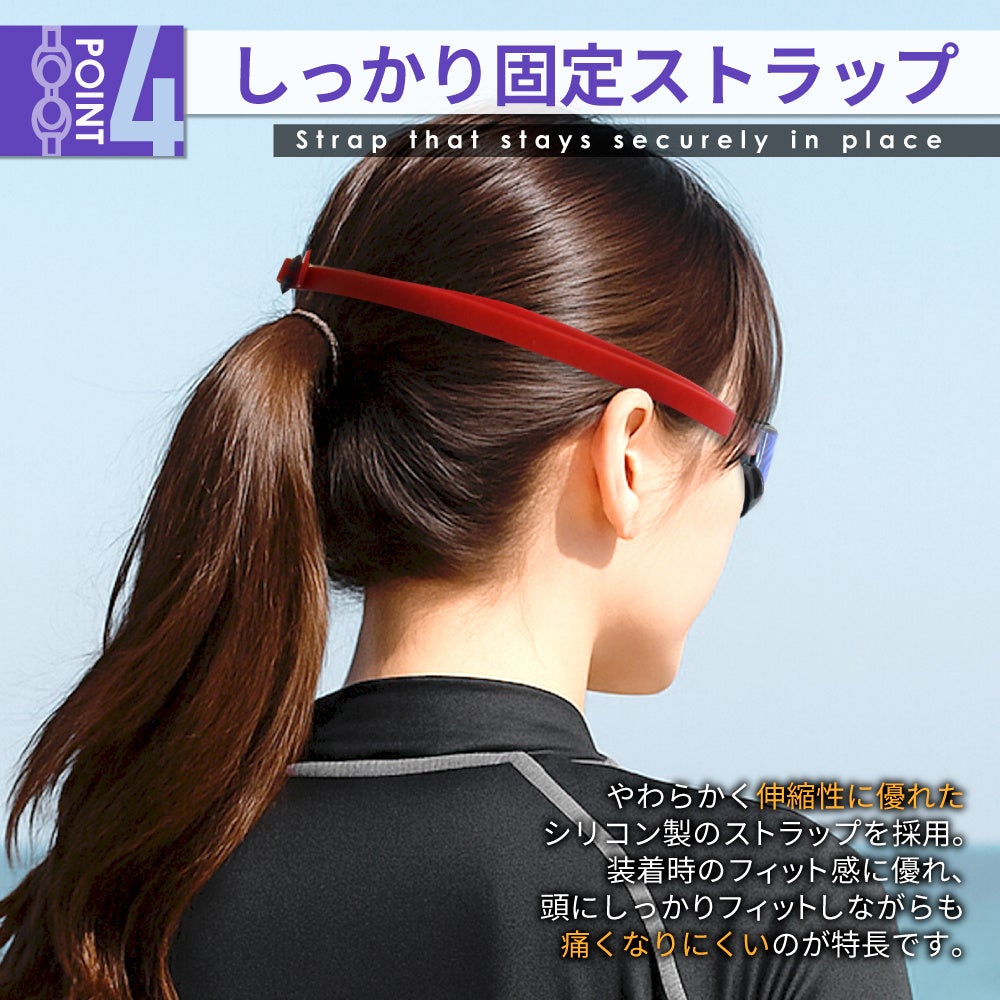 調節可能なストラップで、頭のサイズや好みに合わせてしっかりフィット。ズレにくく、水中でも安定した装着感をキープします。