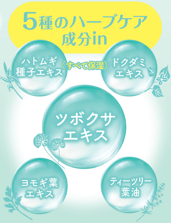 ツボクサエキス、ハトムギ種子エキス、ドクダミエキス、ヨモギ葉エキス、ティーツリー葉油を贅沢に配合。スキンケア効果で健やかな肌をキープします。