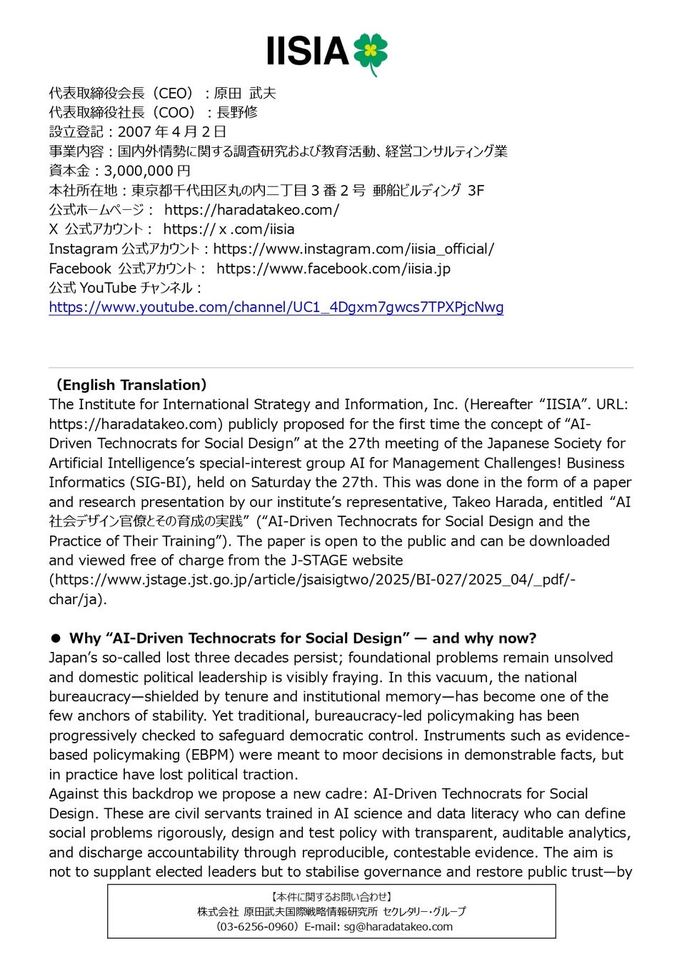 The Institute for International Strategy and Information, Inc. (Hereafter “IISIA”. URL: https://haradatakeo.com) publicly proposed for the first time the concept of “AI-Driven Technocrats for Social Design” at the 27th meeting of the Japanese Society for Artificial Intelligence’s special-interest group AI for Management Challenges! Business Informatics (SIG-BI), held on Saturday the 27th. This was done in the form of a paper and research presentation by our institute’s representative, Takeo Harada, entitled “AI社会デザイン官僚とその育成の実践” (“AI-Driven Technocrats for Social Design and the Practice of Their Training”). The paper is open to the public and can be downloaded and viewed free of charge from the J-STAGE website (https://www.jstage.jst.go.jp/article/jsaisigtwo/2025/BI-027/2025_04/_pdf/-char/ja).