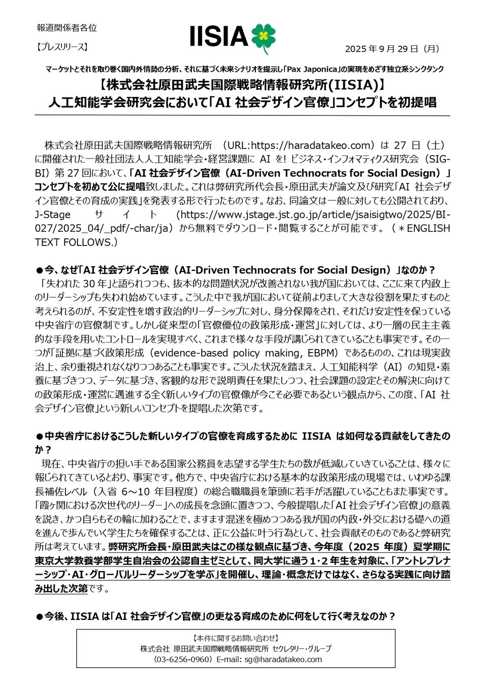 株式会社原田武夫国際戦略情報研究所 (URL:https://haradatakeo.com)は 27日(土)に開催された一般社団法人人工知能学会・経営課題にAIを! ビジネス・インフォマティクス研究会(SIG-BI)第27回において、「AI社会デザイン官僚(AI-Driven Technocrats for Social Design)」コンセプトを初めて公に提唱致しました。これは弊研究所会長・原田武夫が論文及び研究「AI社会デザイン官僚とその育成の実践」を発表する形で行ったものです。なお、同論文は一般に対しても公開されており、J-Stageサイト(https://www.jstage.jst.go.jp/article/jsaisigtwo/2025/BI-027/2025_04/_pdf/-char/ja)から無料でダウンロード・閲覧することが可能です。(*ENGLISH TEXT FOLLOWS.)