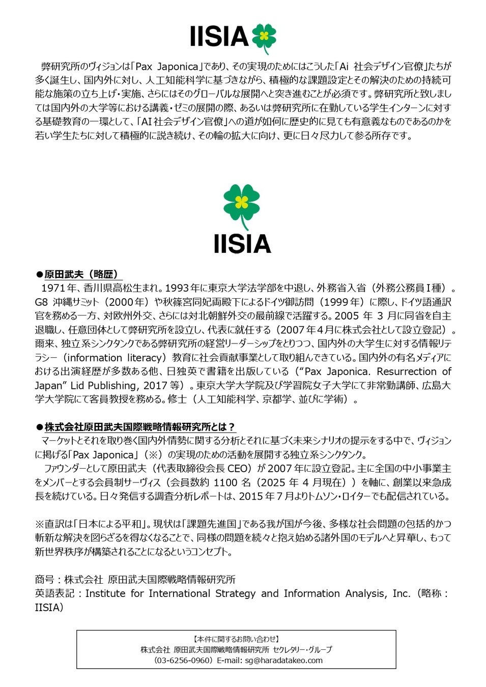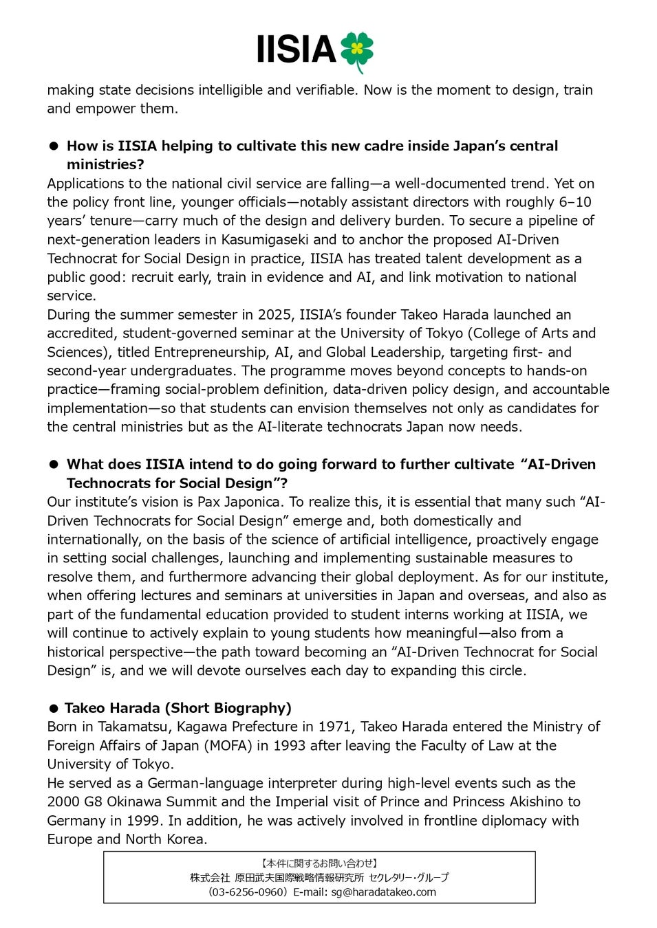 Our institute’s vision is Pax Japonica. To realize this, it is essential that many such “AI-Driven Technocrats for Social Design” emerge and, both domestically and internationally, on the basis of the science of artificial intelligence, proactively engage in setting social challenges, launching and implementing sustainable measures to resolve them, and furthermore advancing their global deployment. As for our institute, when offering lectures and seminars at universities in Japan and overseas, and also as part of the fundamental education provided to student interns working at IISIA, we will continue to actively explain to young students how meaningful—also from a historical perspective—the path toward becoming an “AI-Driven Technocrat for Social Design” is, and we will devote ourselves each day to expanding this circle.