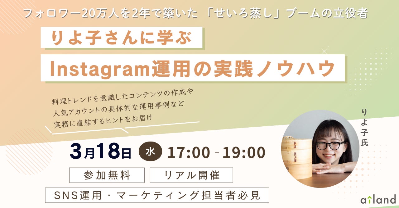 「フーディストノート」「おとりよせネット」「朝時間.jp」などのウェブメディア運営をはじめ、長年にわたり「食」と「ライフスタイル」領域でインフルエンサーマーケティング事業を展開してきたアイランド株式会社(https://www.ai-land.co.jp/ 本社:東京都渋谷区、代表取締役:粟飯原理咲)は、食品メーカーのSNS運用・マーケティング担当者向けに、オフラインセミナー「フォロワー20万人を2年で築いた「せいろ蒸し」ブームの立役者・りよ子さんに学ぶ Instagram運用の実践ノウハウ」を、2026年3月18日(水)に「外苑前アイランドスタジオ(東京・外苑前)」にて開催いたします。
