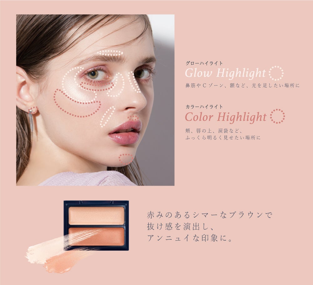 ツヤと血色感で透明感あふれる肌を演出する、2色のハイライト。