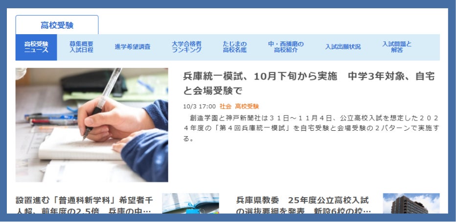 株式会社神戸新聞社(本社:兵庫県神戸市)は兵庫県内の公立高校を中心に、志望校選びから出願状況まで、受験に関する情報をニュースサイト「神戸新聞NEXT」で配信します。今年は推薦入試関連のデータや情報も大幅に充実予定です。高校受験はお子さんの将来選択の第一歩。学力面はもちろん、早めの準備が大切です。神戸新聞社は、事前にしっかりと情報収集をして本番に臨みたいという保護者のみなさんと受験生を全力でサポートします。