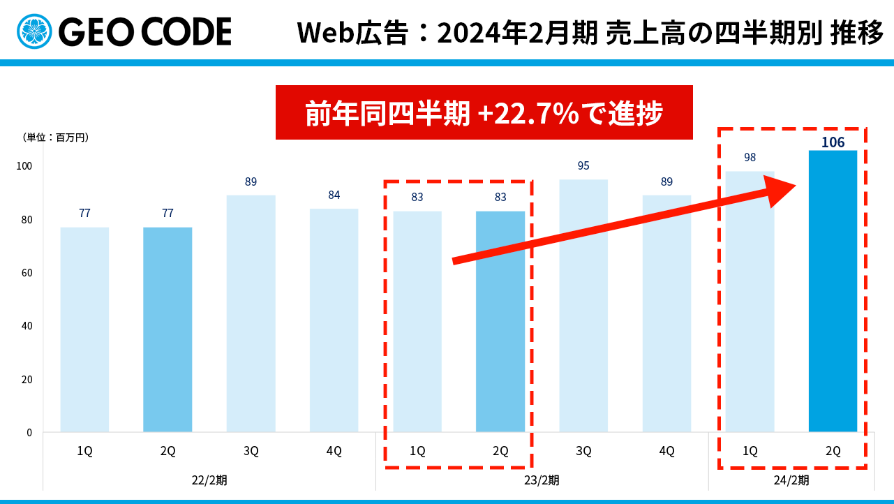 社会のデジタル化が進むなかでインターネット広告市場は引き続き拡大傾向にあり、その追い風を受けて、10月13日発表の2024年2月期第2四半期決算では、Web広告の売上高が前年同四半期比+22.7%の水準で進捗しています。今後も、Web広告の需要増の波を捉えて、事業の拡大に尽力していきます。