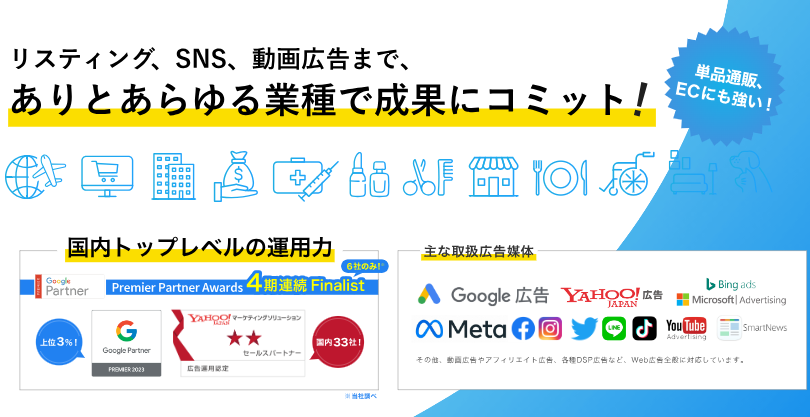 累計アカウント数2,120件、運用アカウント数495件の豊富なWeb広告運用実績と、GoogleやYahoo!に認められた確かな広告運用力があります。Googleが主催する「Premier Partner Awards」では、5期連続の国内ファイナリストに選出されており(※1)、Yahoo!のパートナー制度では、2つ星の代理店として認定を受けると同時に、国内で28社のみの広告運用認定パートナーとして選出されています(※2)。