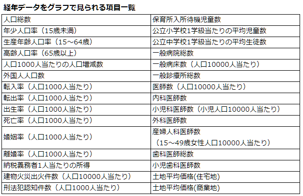 経年データがグラフで見ることができる項目は以下の30項目です。