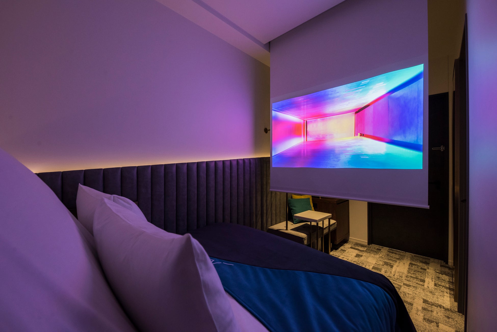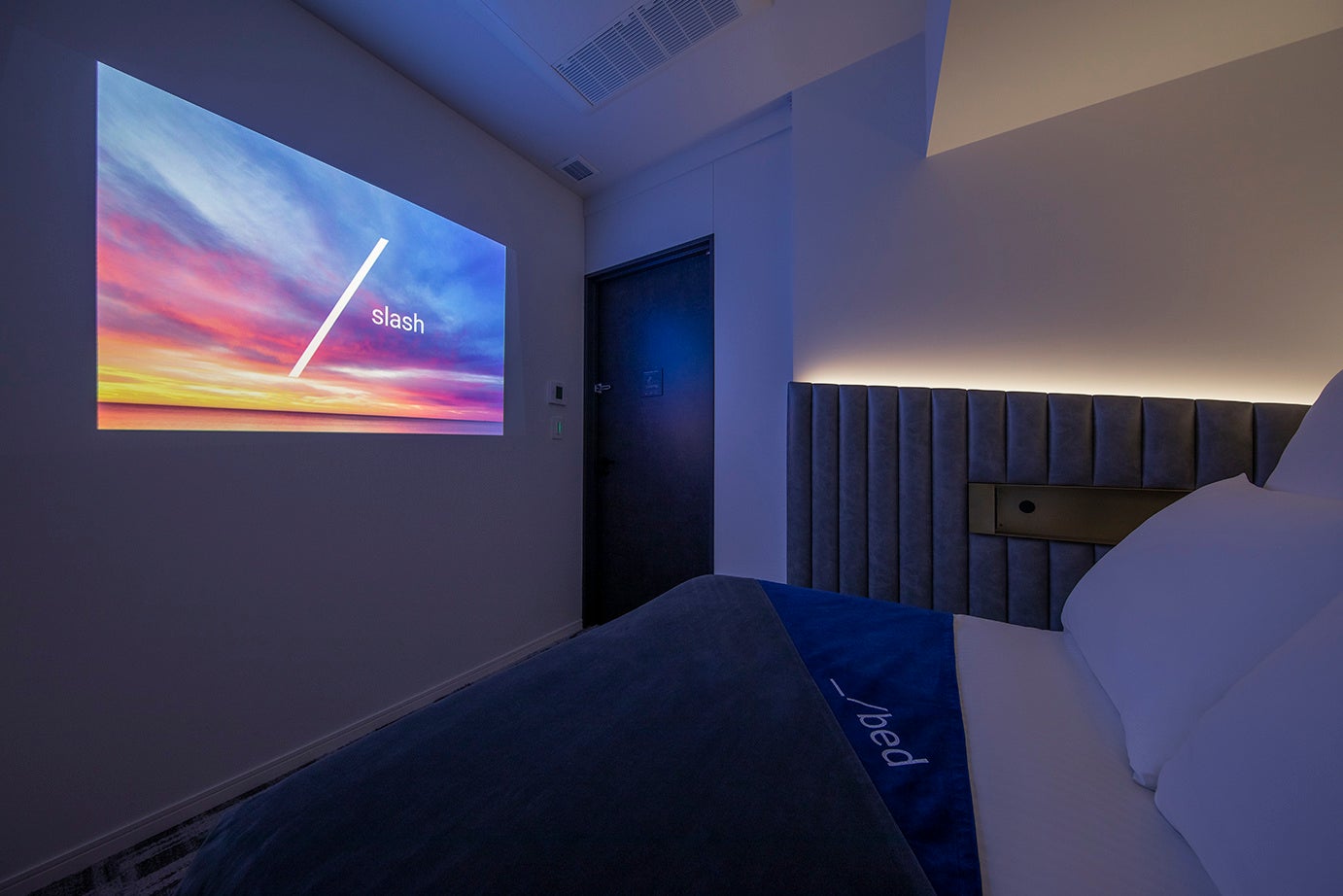 デジタルテクノロジーを活用したホテルslash 川崎は、全ての客室に高性能プロジェクターを完備しています。ホテルクラスの快適なリクライニングベッドで寛ぎながら、スポーツ観戦やオンラインライブ、映画鑑賞等を大画面で楽しむことができ、ホテルならではのプライベート空間で没入感のある非日常を体験することができます。