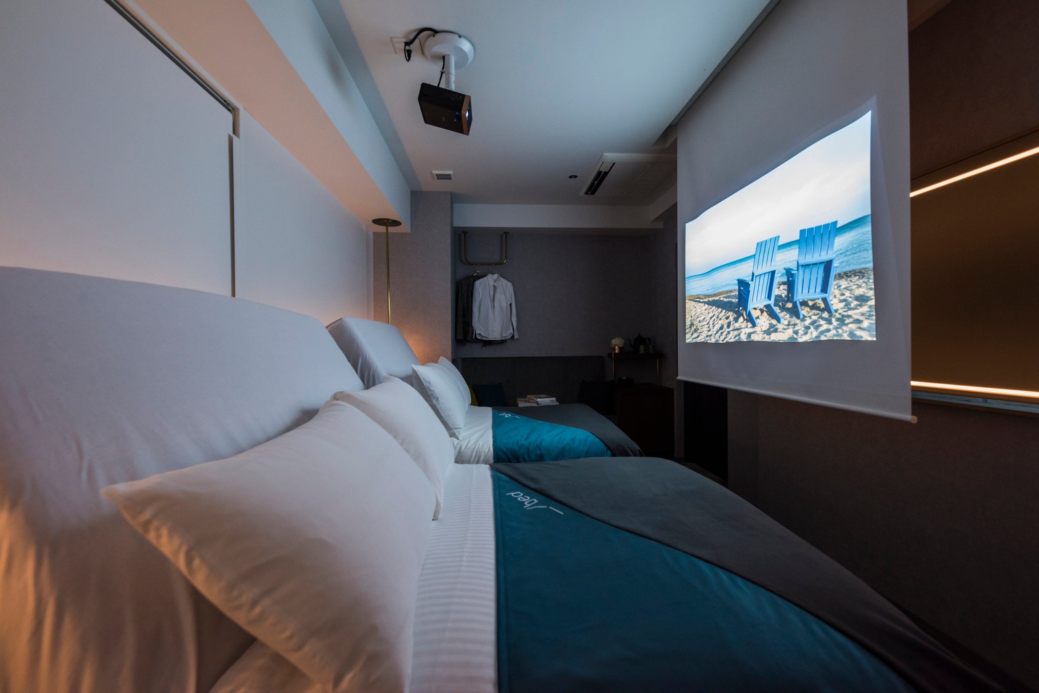 120㎝のセミダブルベッドが2台備わった20㎡の客室。映像を投影する電動スクリーンが備わっています。