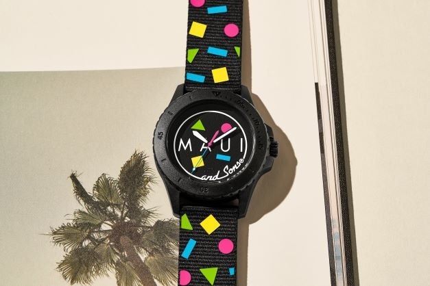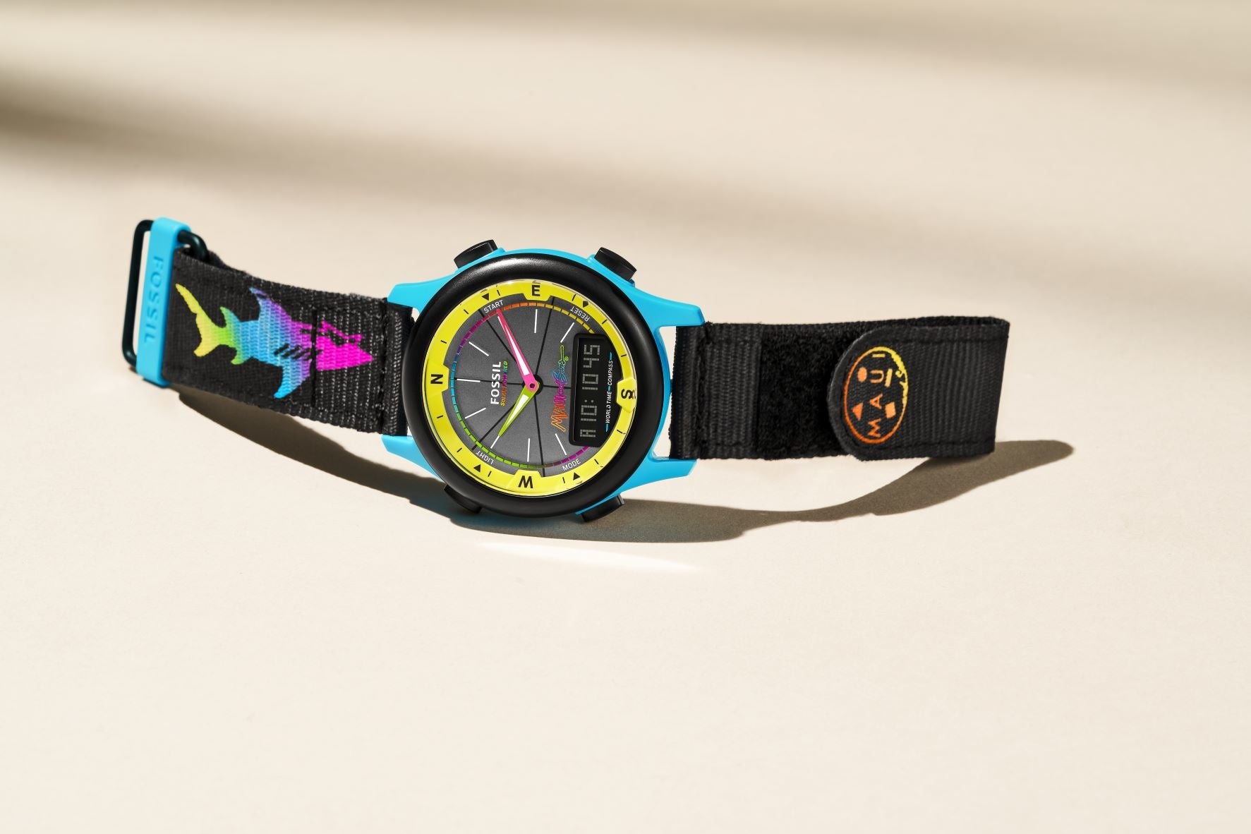 「このコラボレーションは、両ブランドのルーツである楽観主義、創造性、信頼性、そして母なる自然への称賛を体現しています」とマウイ アンド サンズのマーケティングディレクターDakota Scoppettuolo(ダコタ・スコペトゥーロ)は述べています。「エコフレンドリーな素材に、大地、風、火、海を象徴するマウイ アンド サンズのシャークやクッキーロゴをポップな80年代のカラーリングで表現し、フォッシルの流線型で革新的なデザインに融合させた時計になっています。これらの時計を身につけた人が、自然への大きな憧れと感謝の気持ちとともに、それぞれのやりたいことに時間を使うきっかけになればと願っています。」