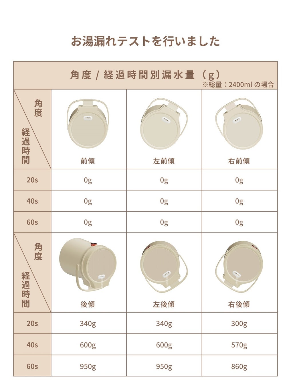 ※後傾の場合は吹き出し口からお湯が漏れるため、小さなお子さまを近づけないようご注意ください。また、上記は試験環境での結果であり、転倒時の角度の違いや給水量がテストより多い場合はさらに漏れる可能性があります。