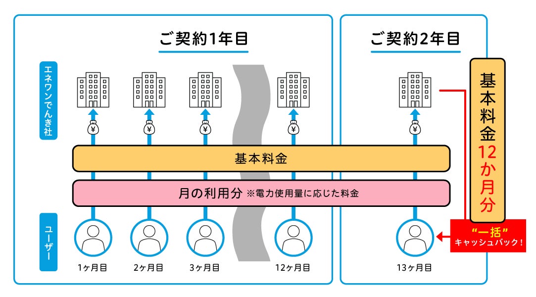 エネピ経由で『エネワンでんき』を契約すると、1年間分の基本料金が実質0円になるキャッシュバック特典が受け取れます