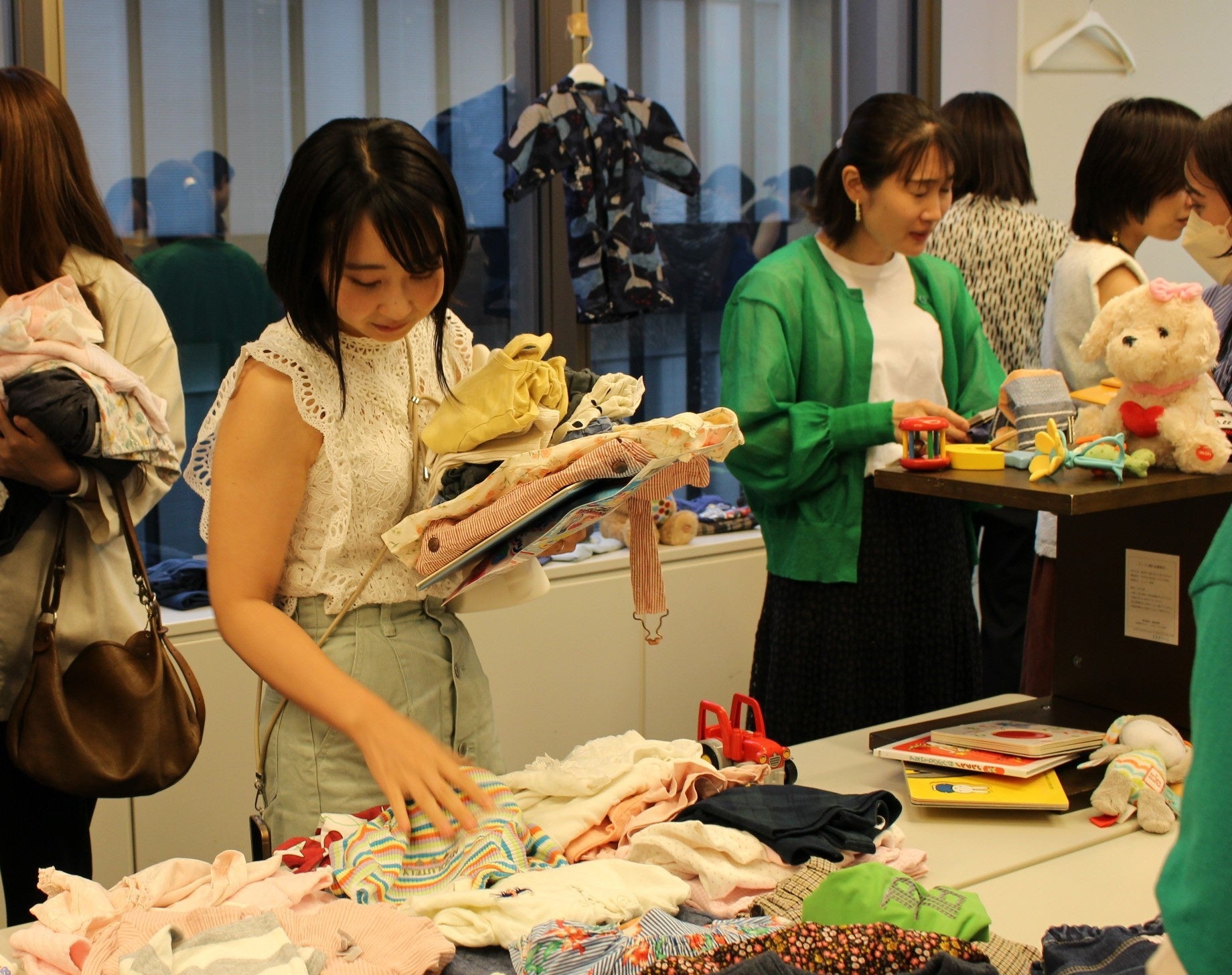 子どもの成長とともにサイズアウトしてしまった洋服など短期間で使わなくなってしまった育児用品を、社内で育児用品を必要としているママ・パパに譲渡するイベント。