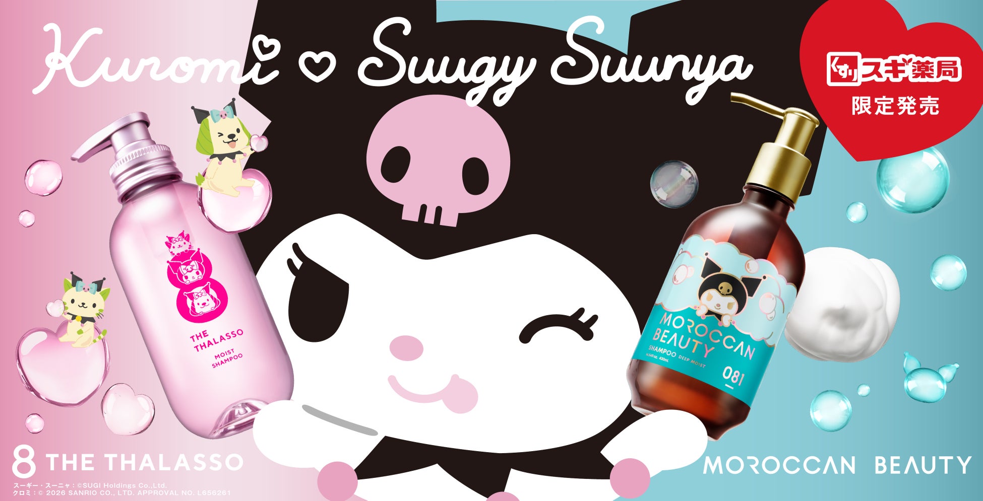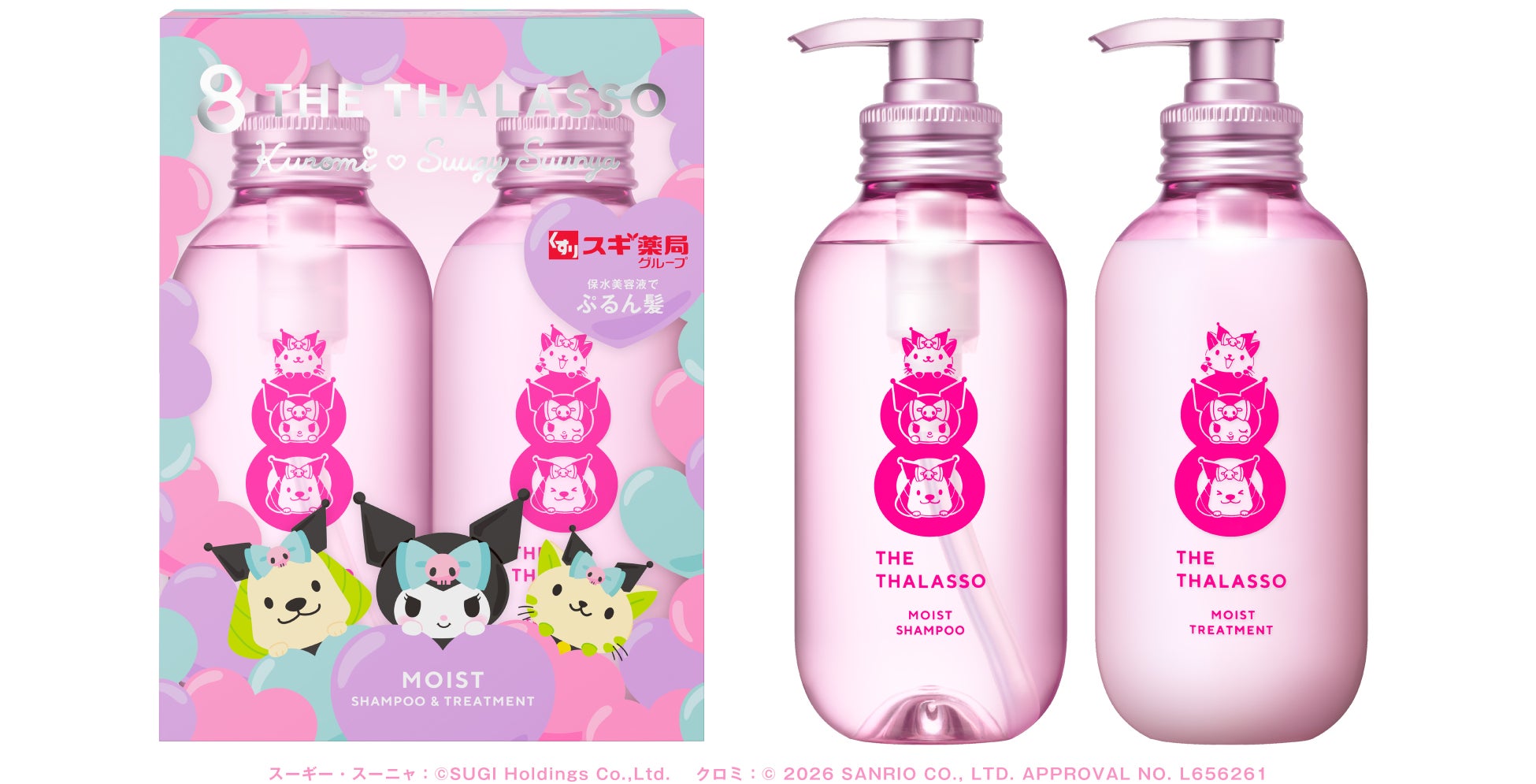 ステラシード株式会社は、スキンケア発想の保水美容液ヘアケアブランド「8 THE THALASSO(以下、エイトザタラソ)」より、スギ薬局グループ公式キャラクター「スーギー&スーニャ」と株式会社サンリオのキャラクター「クロミ」とのコラボレーションデザインアイテムを全国のスギ薬局にて数量限定で発売いたします。