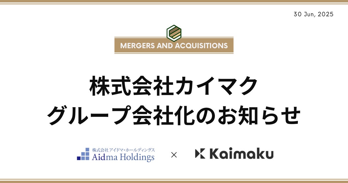 人の力とテクノロジーで再現性のある経営ソリューションを提供する株式会社アイドマ・ホールディングス(本社:東京都品川区、代表取締役:三浦 陽平、以下:アイドマHD)は、採用人事DB、AIマッチングテクノロジーを活用したHRプラットフォームを提供する株式会社カイマク(本社:東京都渋谷区、代表取締役:大島 黎 、以下:カイマク)の株式を取得し、2025年6月27日(金)に連結対象のグループ会社化したことをお知らせします。