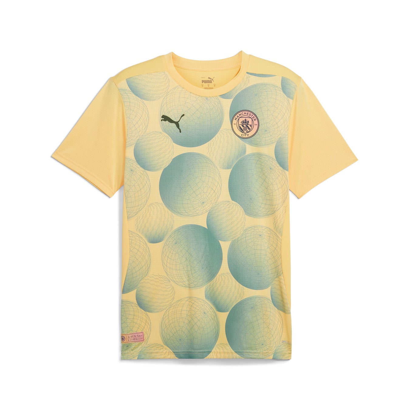 ユニフォームは、ヨーロッパの一部の試合でのみ使用され、クラブが欧州の大舞台で輝きを放つ姿を表現しています。デザインは、Definitely Maybeの象徴的なイメージに呼応する大胆な美学を特徴とし、マンチェスターの街とバンドに敬意を表しています。カラーリングは、ライトストローをベースに、ブルーのサイドパネルと袖を配し、袖口やパネルには控えめなポピーピンクのディテールが施されています。マリンブルーの音波模様がユニフォームにあしらわれており、OASISのアルバムジャケットのカラーパレットを巧みに取り入れています。