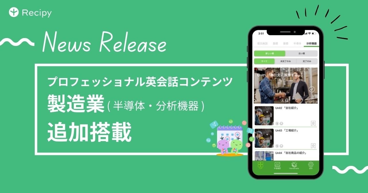 ビジネス英語にも強い英語学習アプリ『レシピー』が、プロフェッショナル英会話コンテンツに「製造業(半導体・分析機器)」を追加搭載 - 株式会社ポリグロッツ( POLYGLOTS )
