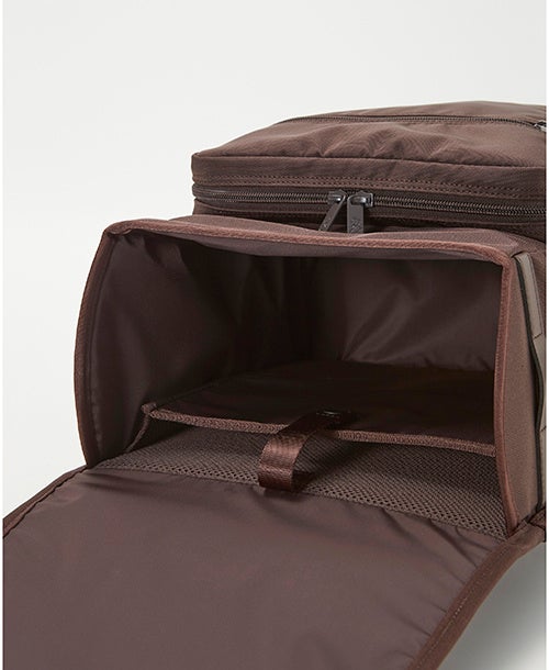 たくさんの荷物もすっきり入る大容量。タブレットを安全に収納できるベルト付き。