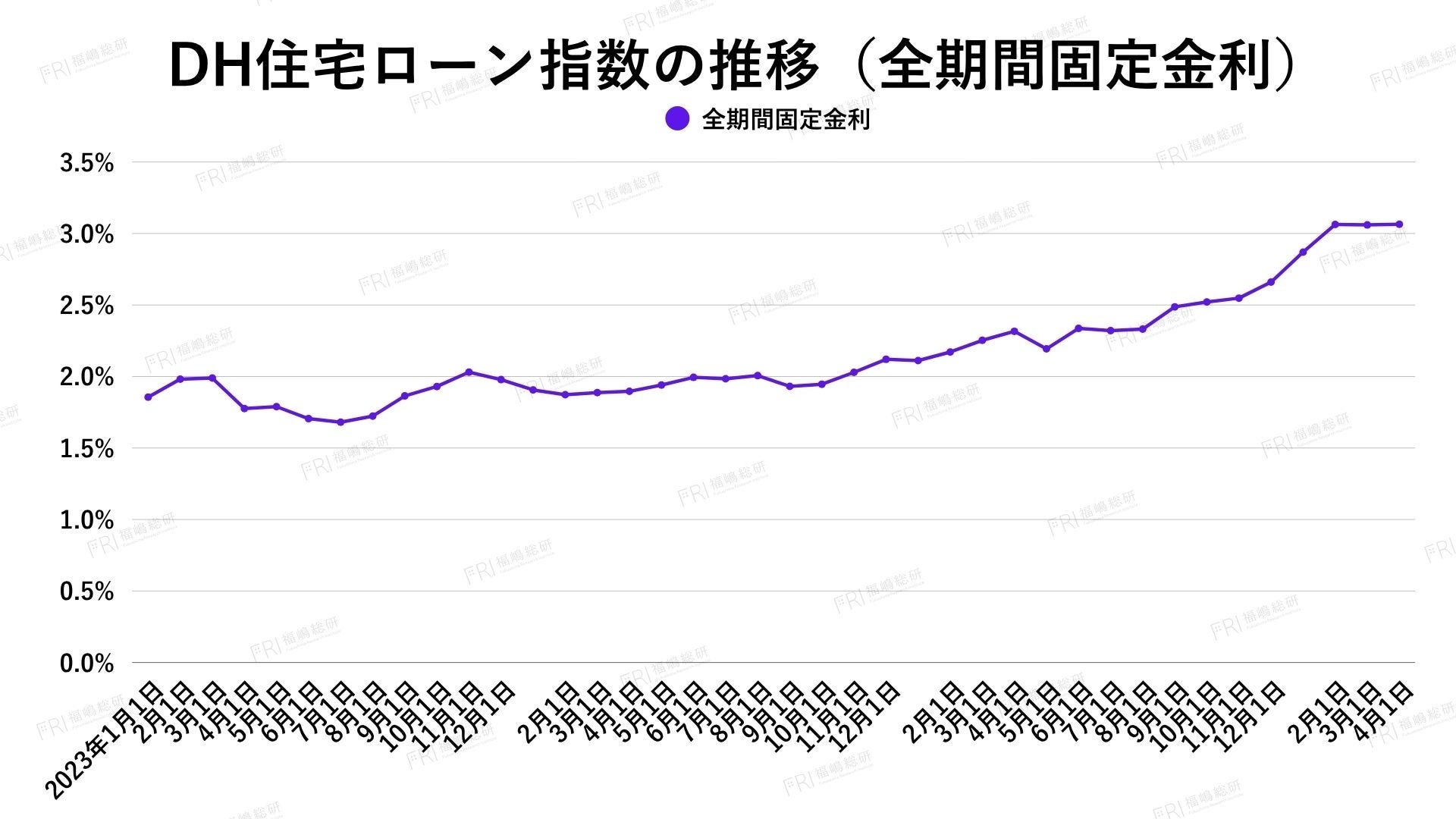 2026年3月の全期間固定金利は横ばいながら、DH住宅ローン指数は3.064%と高水準を維持し、前年からの上昇基調が続いています。全金融機関が金利を引き上げるなど上昇圧力は明確で、フラット35も含め市場全体で水準切り上げが進行しています。