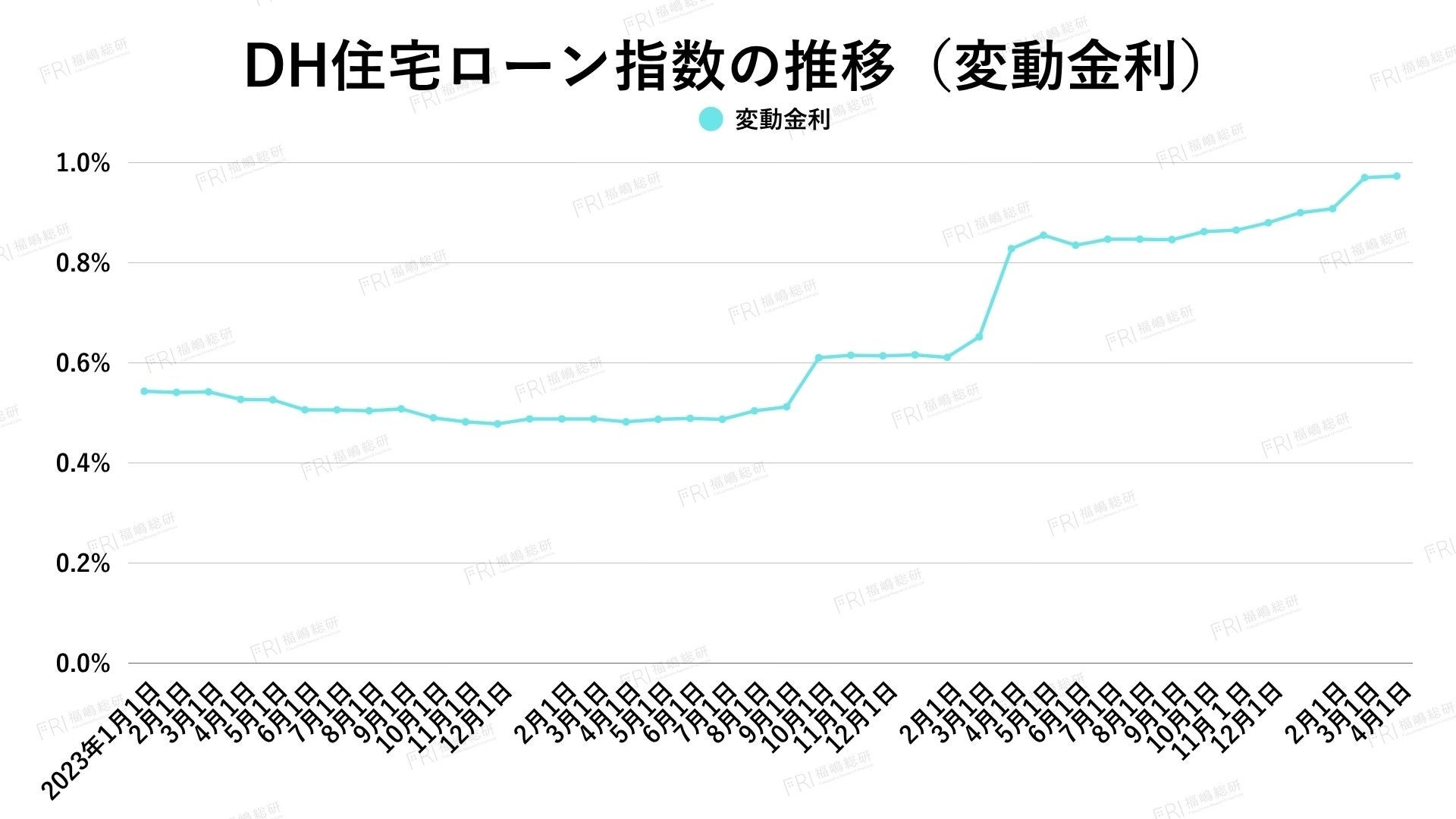 2026年3月の変動金利は横ばいでしたが、DH住宅ローン指数は0.973%と前月の0.908%、前年の0.652%を上回り、緩やかな上昇トレンドが継続しています。急激ではないものの、水面下で着実に金利水準が切り上がっている状況です。