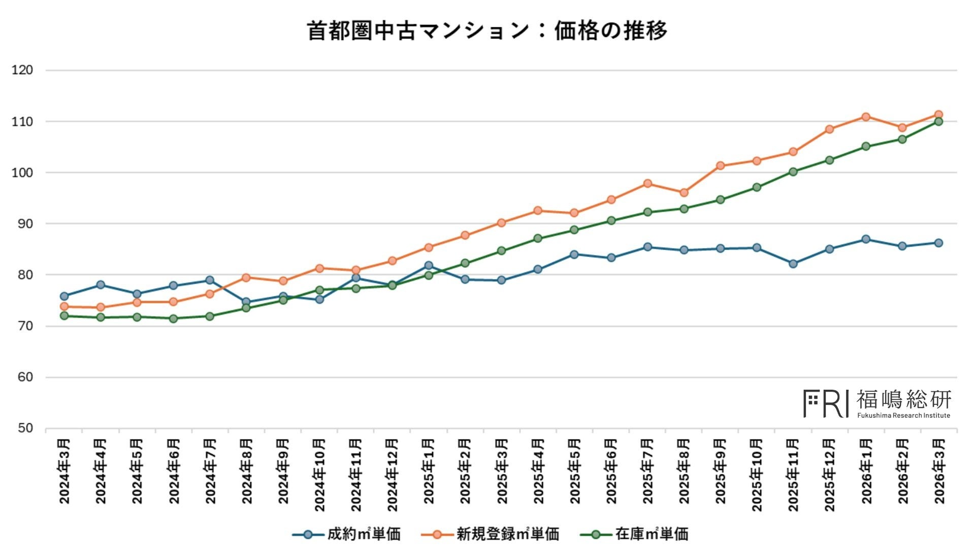 東日本不動産流通機構の公表データによれば、首都圏における2026年3月の中古マンション成約㎡単価は、前年同月比で71ヶ月連続の上昇を記録しました。