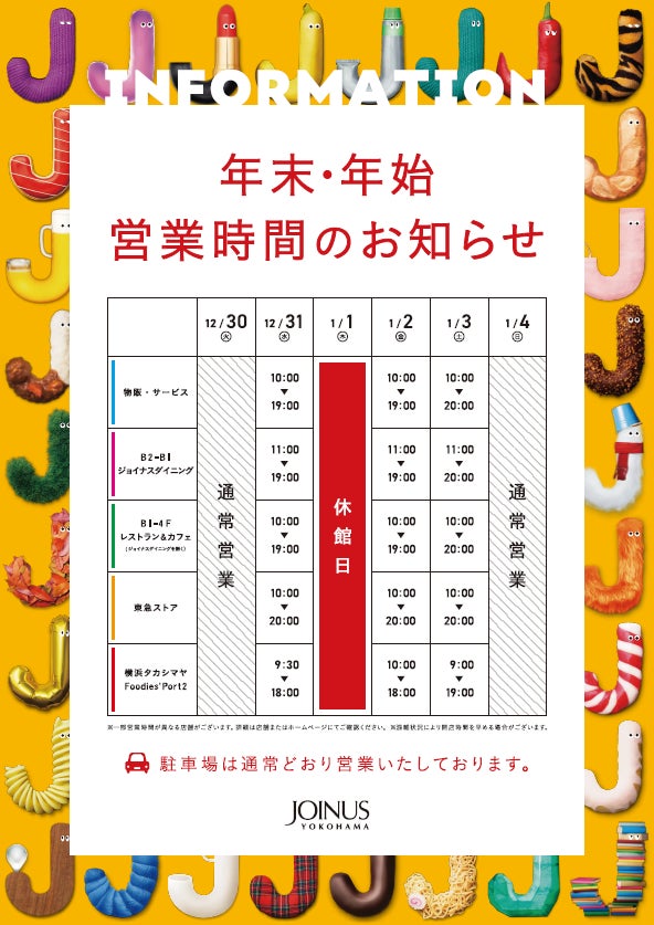 【営業時間】 1月2日(金) 10:00~19:00 (B1・B2ジョイナスダイニング 11:00~19:00)