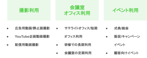 〜広告用動画撮影、サテライトオフィス、会社総会などスペースの提案から予約までをサポート〜