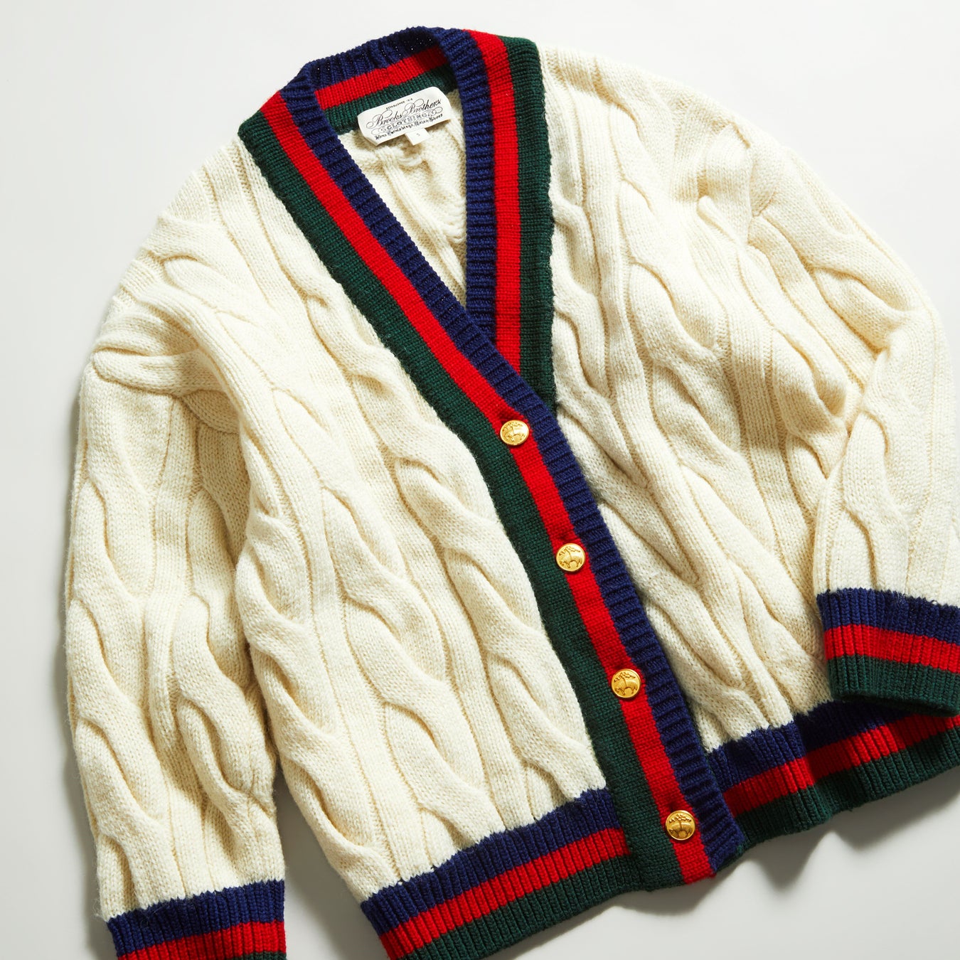 立体感のあるケーブル編みとふんわりと体を包み込む着心地ゆったりとしたドロップショルダーに仕上げました。ウォーターバリー製のゴールドボタンを使用。サイドポケット付