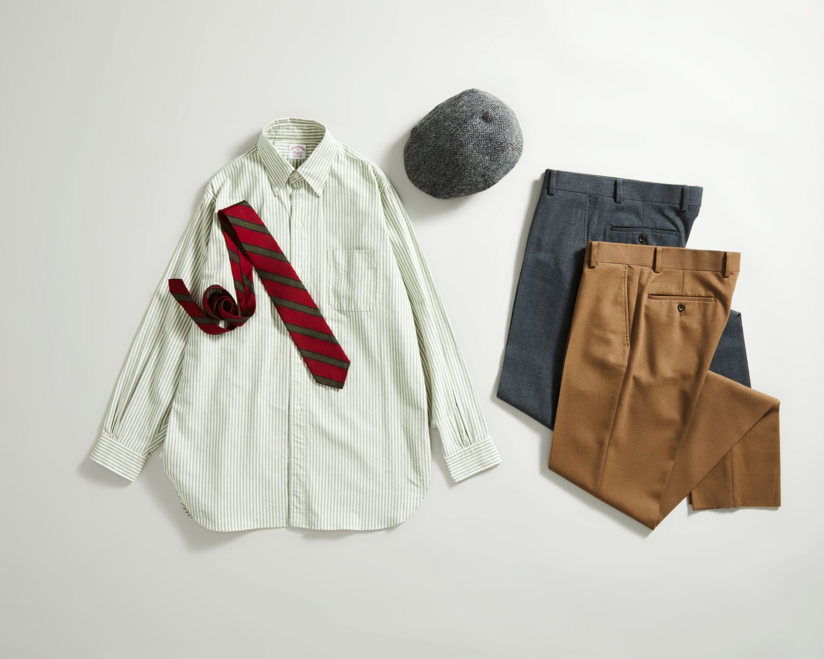 ブルックス ブラザーズが生み出したポロカラー(ボタンダウン)シャツは、100%米国産スーピマコットンオックスフォードを使用。ガゼットについたセルビッチ(赤耳)がアクセントに。当時の工場管理の象徴であるスタンプナンバーリングも前タテ裏に再現。モデルは赤タグのオリジナル6個釦。<ネクタイ>1970年代~80年代初頭に展開していたブルックス ブラザーズの代表的なネクタイコレクションを現代的にアップデート。アメリカ製<パンツ>英国由来のキャバリーツイル素材を採用。シルエットは細すぎず、太すぎずの程よいレギュラーフィット。カーキ、グレー2色展開。<ハット>ノーフォークジャケットと同素材のアイビーハット。