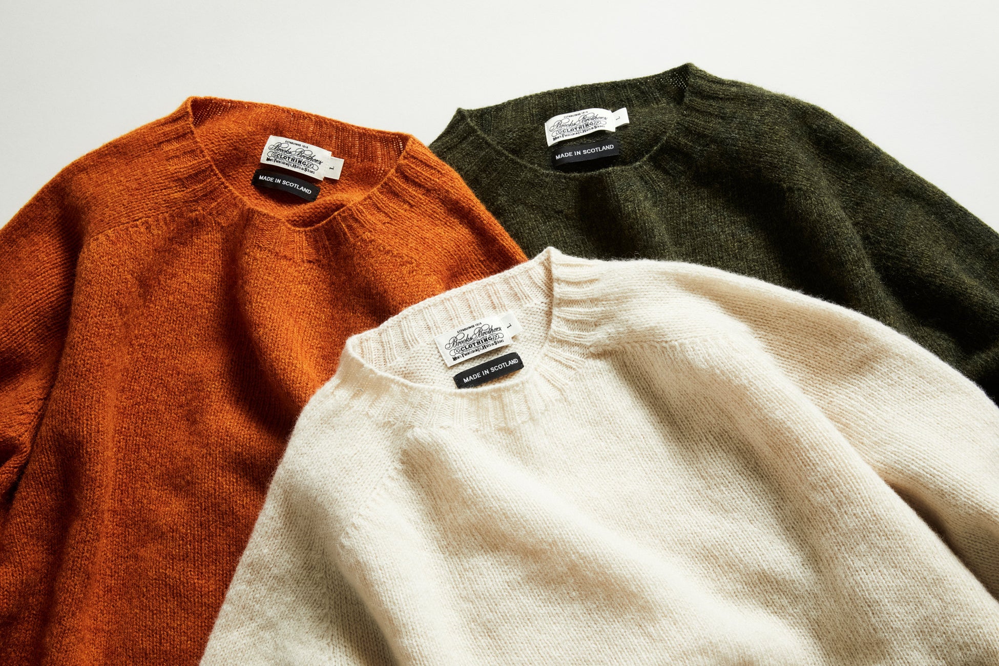 シェットランド島の羊の毛を、シェットランド島で紡いだ糸を使用したシェットランドセーター。スコットランド製。当時と同じサドルショルダーのデザインを採用しつつ、ホールガーメント製法やクルーネック部分をシングルで編み上げるなど、現代的にアップデート。第1弾に登場したネイビー、グレーに加え新色のグリーン、クリーム、オレンジの3色が追加。