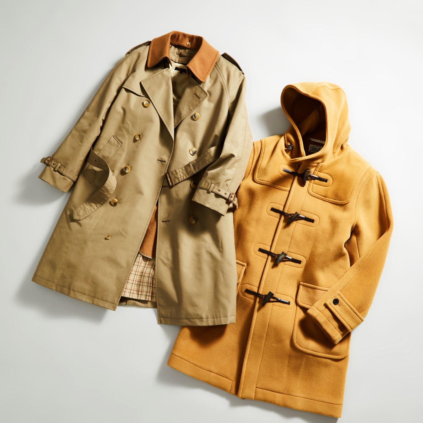 1980年代のカタログに描かれていたアメリカ製のトレンチコートを再現。現行のものよりウエストの位置を高く設定しているデザインや光沢感のあるゴールドの取り外し可能なライナーなど当時のコートを忠実に再現。超高密度コットン/ポリエステル素材を採用。取り外し可能なウールの襟、貫通ポケット、インバーテッドプリーツ、アンブレラヨークなどトレンチコートとしてのクラシックなディテールを全て踏襲。1990年代当時に使われていて多くの高級メゾンでも採用されていた生地メーカーが使っていたものと同じ織機を使って再現したダッフルコートは、上質なトリプルパイルヘリンボーンウールを採用。立体感のあるフードと一体化したチンストラップやドロップショルダー、ゴールデン フリースロゴが入ったリアルホーンのトグルなど細部にまでこだわり仕上げました。