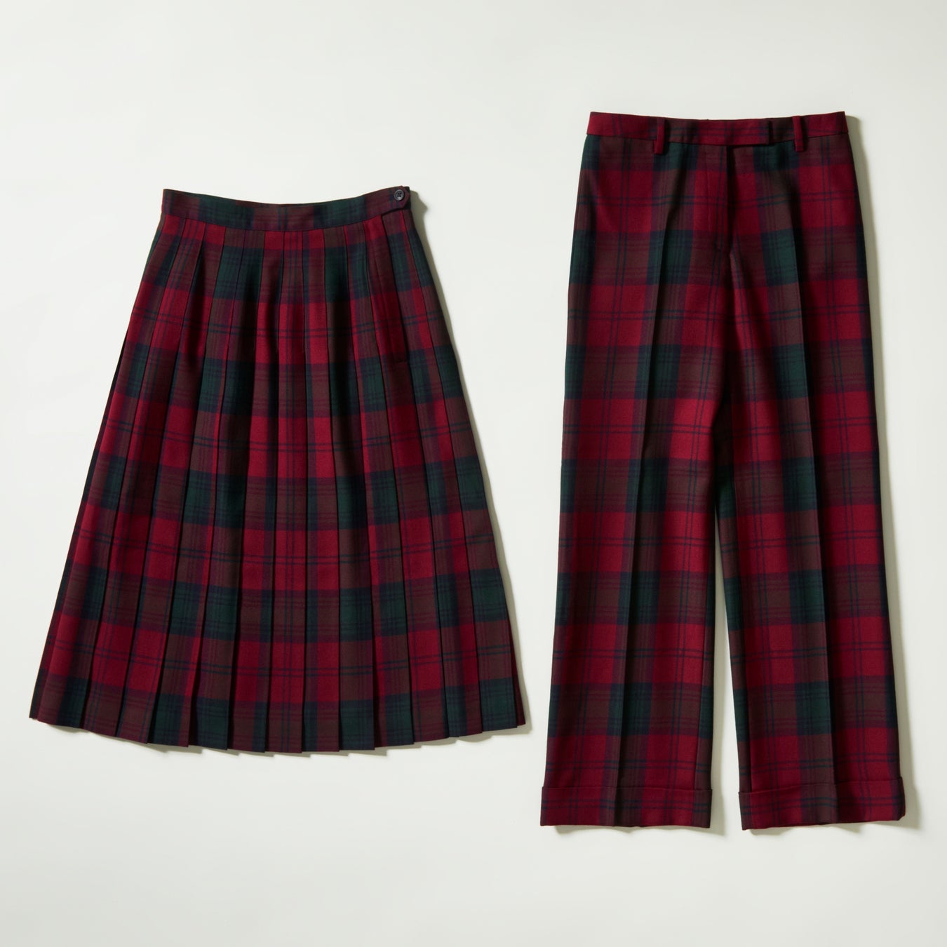 クリエイティブ ディレクターのマイケル・バスティアンが所有していたアーカイブアイテムを再現。落ち着いたバーガンディと深緑のタータンチェック柄(リンゼイタータン)のウールサージ生地を使用。通常よりもやや太番手の糸をしっかり打ち込むことでヴィンテージライクな雰囲気を表現しています。パンツは、セミワイドシルエットに幅広のダブルカフ、スカートはミディ丈のクラシカルなプリーツスカート。どちらもタイムレスに活躍するアイテムです。