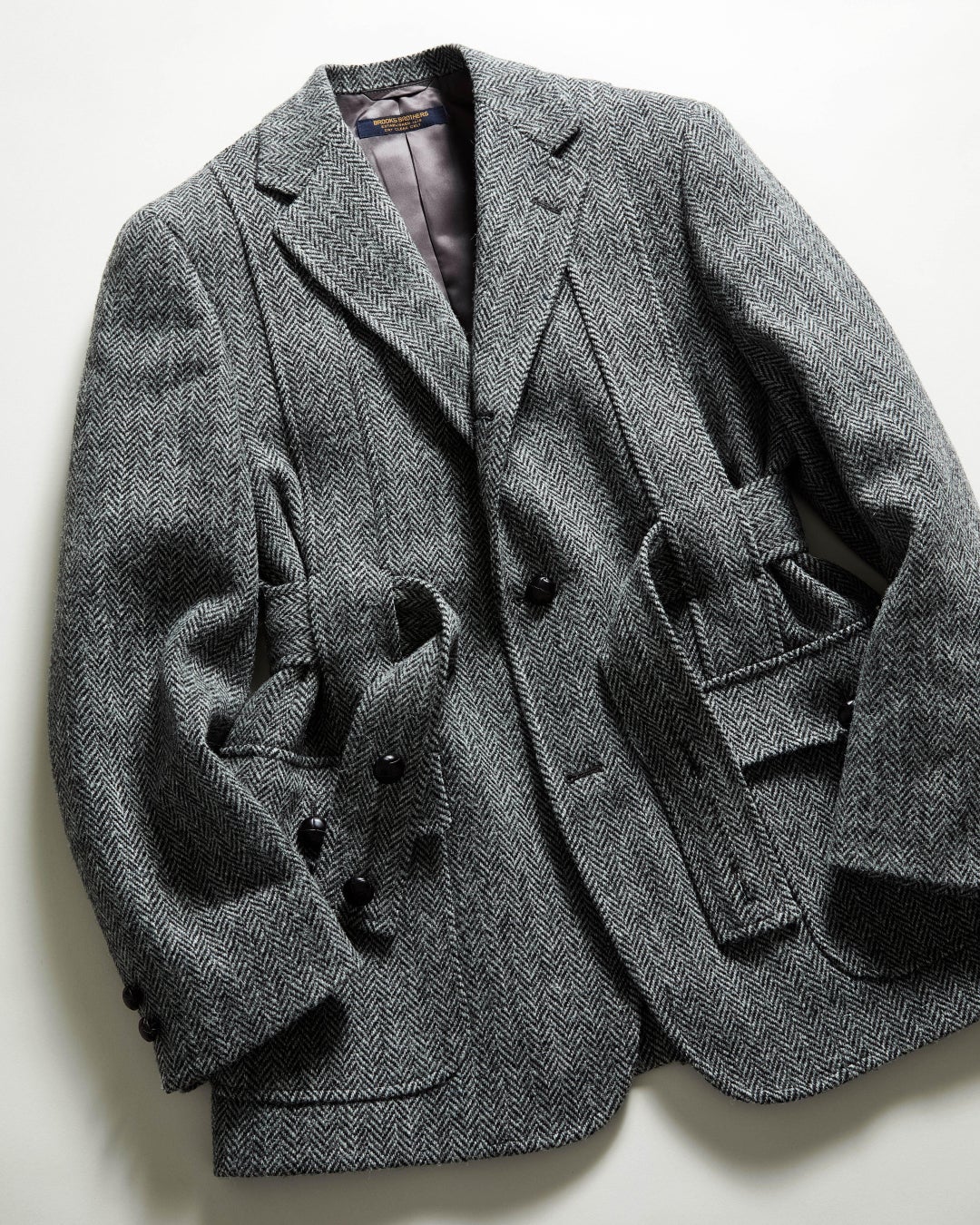1920年代のアメリカを代表する人気作家スコット・フィッツジェラルドが着用していたノーフォークジャケットから着想を得て、最もオーセンティックなノーフォークジャケットを再現。英国ハリスツイード生地を使用。レザーのくるみボタンでクラシカルな英国調。センターベント仕様。中央のベルトは取り外し可能。