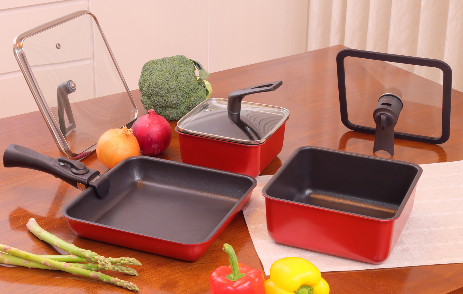 セット内容:20cmマルチパン2個、24cmフライパン2個、16cmミニパン2個、着脱式取っ手2個、20cm無水調理用フタ2個、24cmガラスフタ2個、16cmガラスフタ2個
