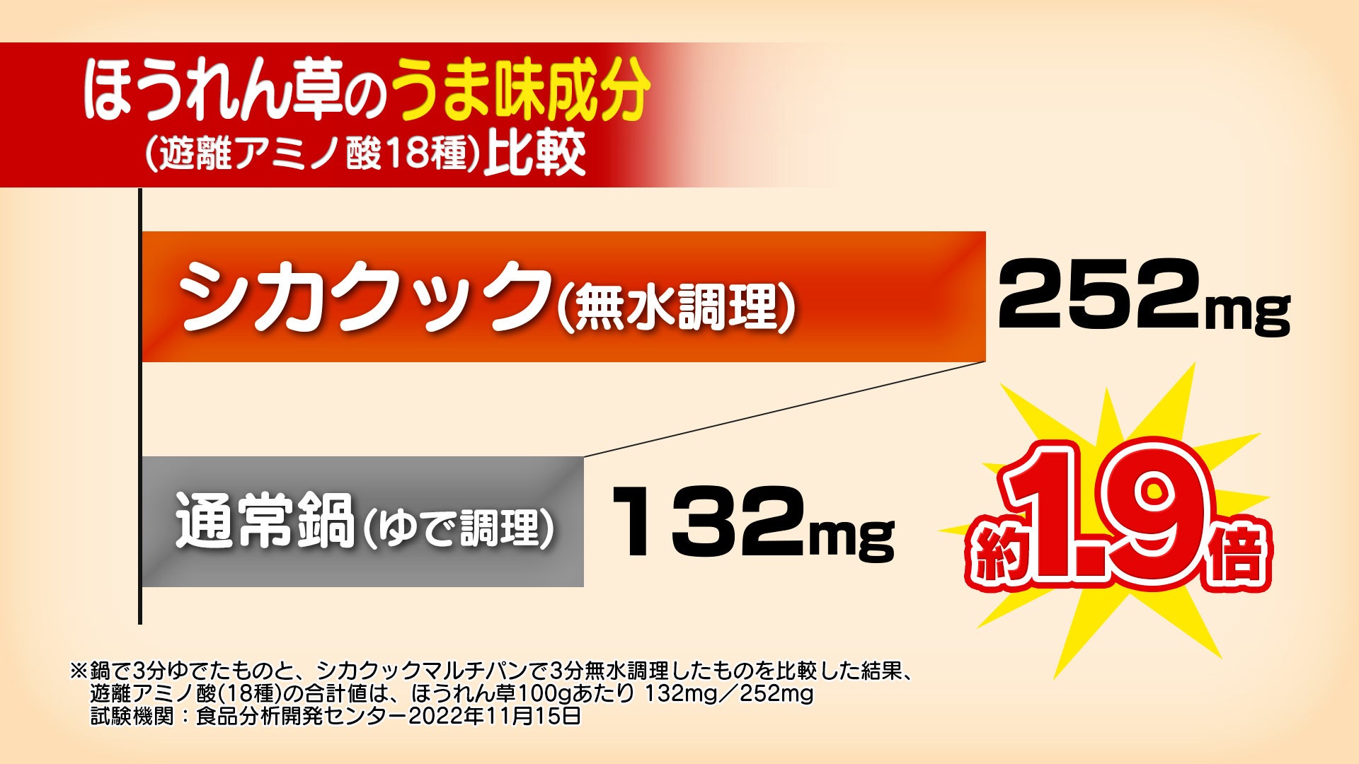※1 鍋で3分ゆでたものと、シカクックマルチパンで3分無水調理したものを比較した結果、ほうれん草(100g)の遊離アミノ酸(18種)は、通常鍋でのゆで調理では132mgになの対し、シカクックマルチパンの無水調理では252mg(190.9%)。(試験機関:食品分析開発センター2022年11月)