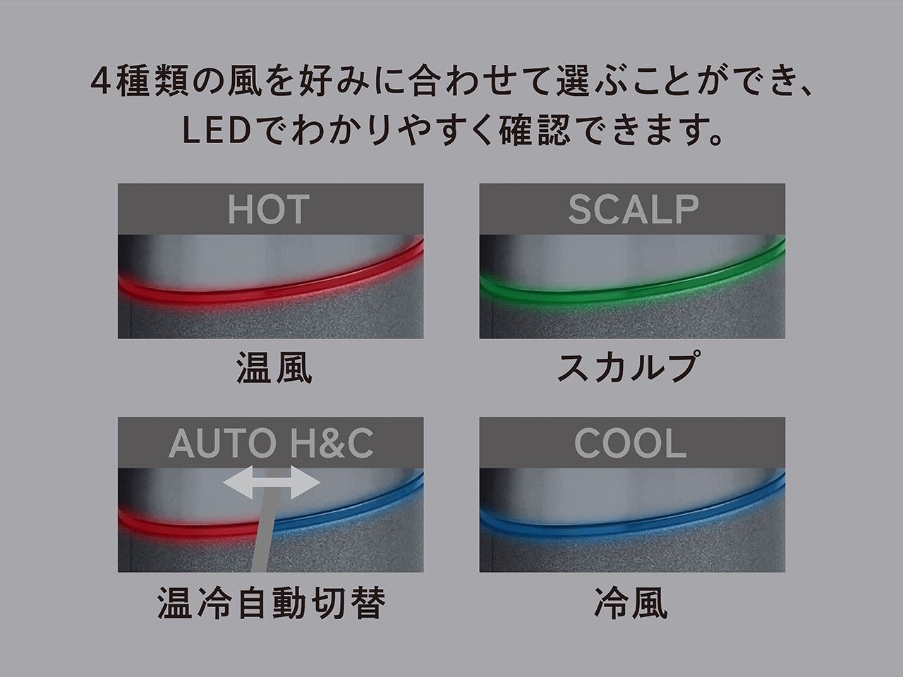 ・使いやすい4つのモード(HOT/SCALP/AUTO H&C/COOL)。モードはLEDで分かりやすく確認。