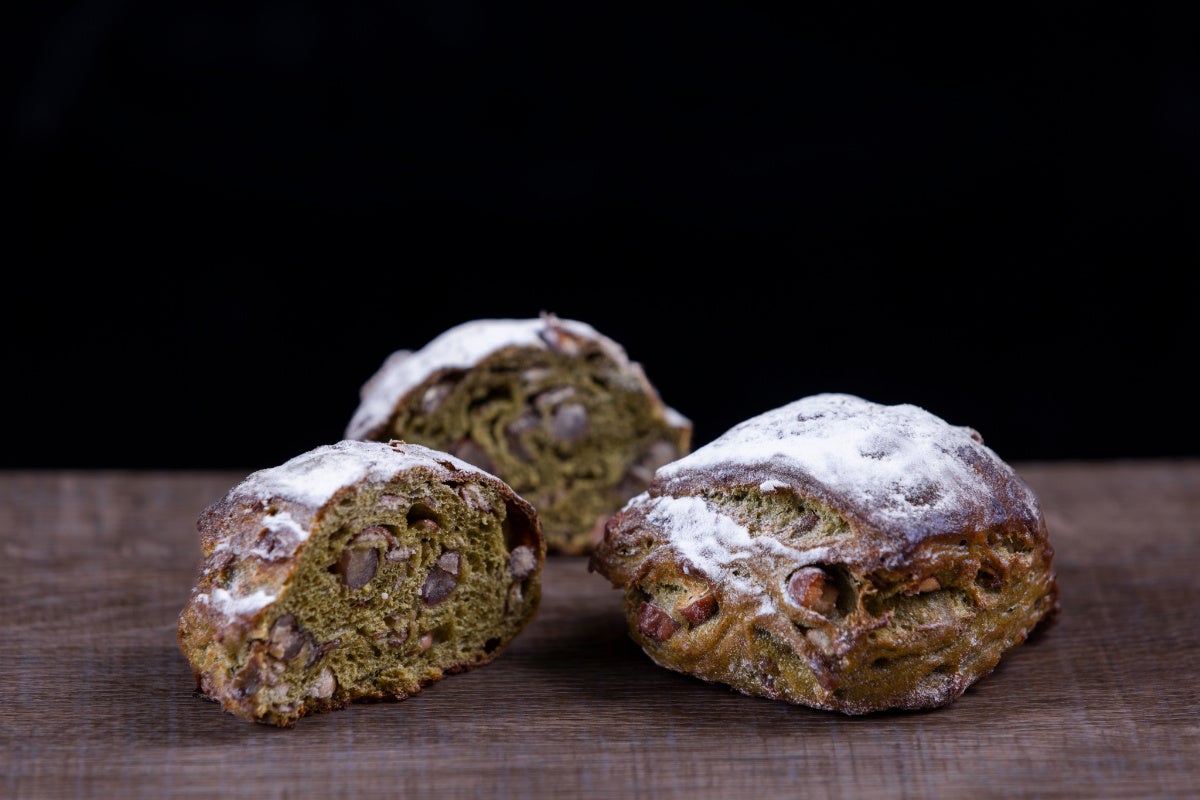 「新緑園」の緑茶を使用した、風味豊かなモチモチ生地のリュスティック。生地の中には北海道産の大納言小豆が入っており、緑茶の苦みと小豆の甘味のバランスが絶妙にマッチした一品です。