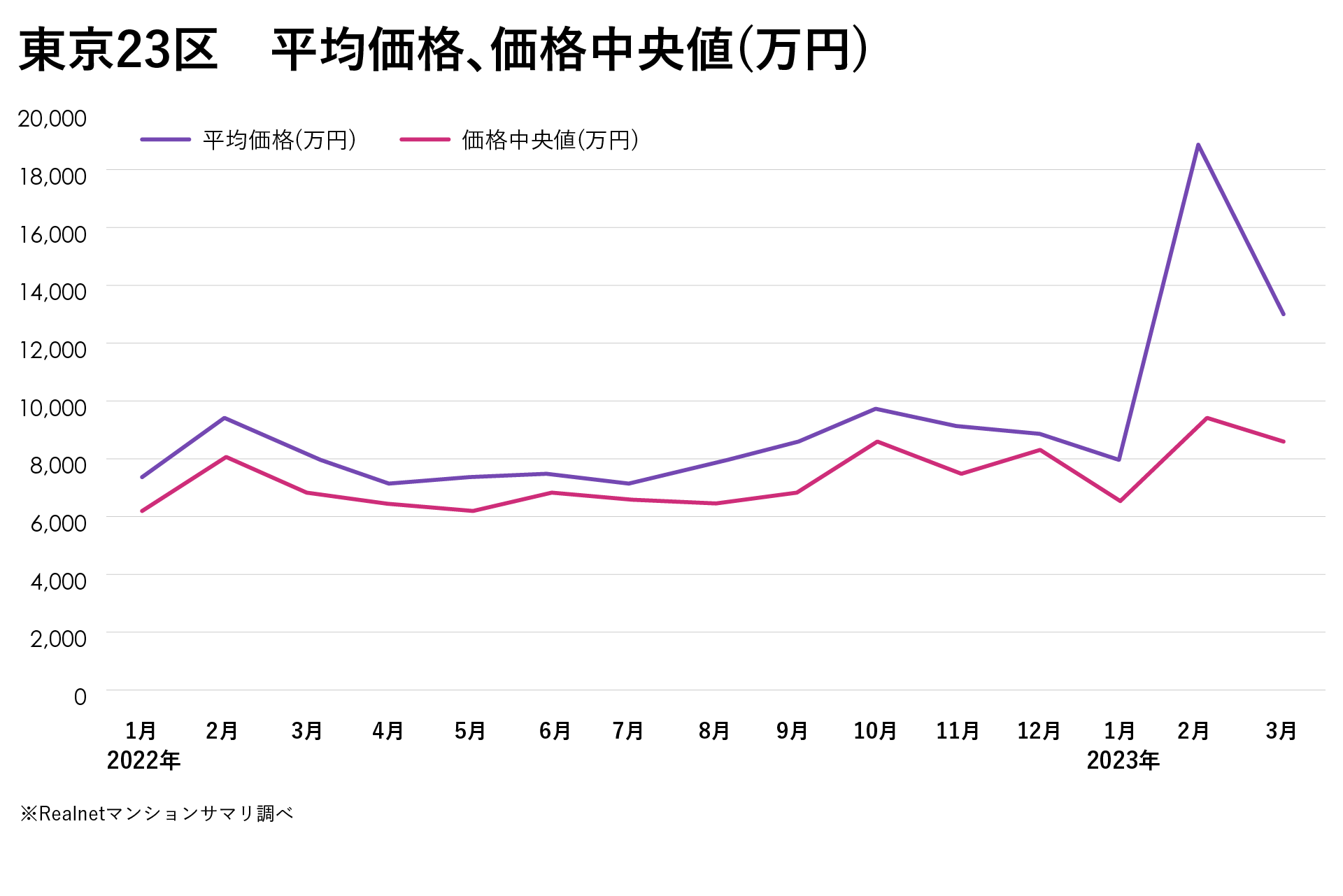 東京都港区の三田ガーデンヒルズの初回分譲が行われた2023年2月は、平均価格1億8,868万円に対して価格中央値が9,299万円で、平均と中央値で約2倍の差が生じています。