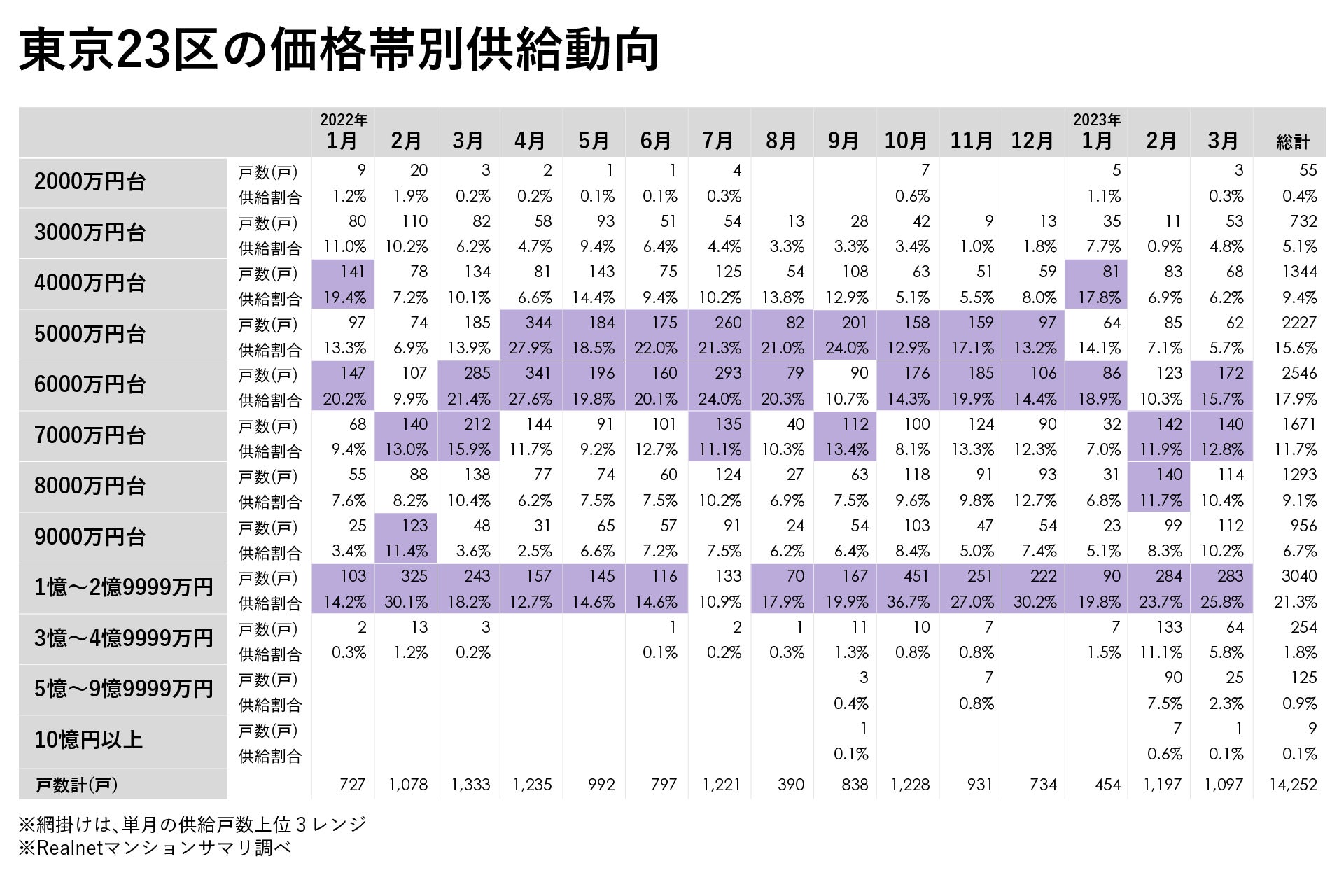 上記の表は、東京23区の2022年1月以降の供給戸数と、その月の供給割合を価格帯別でまとめたものです。