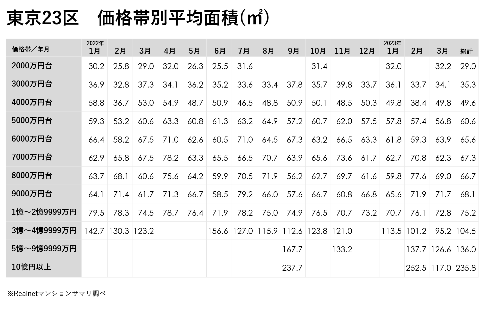 上記の表は東京23区の2022年1月以降の価格帯別の平均面積です。