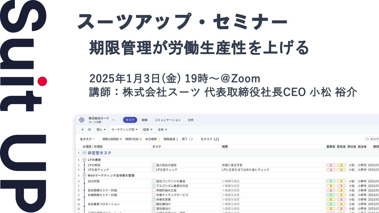 株式会社スーツ(所在地:東京都千代田区、代表取締役社長CEO:小松 裕介)は、2025年1月3日(金)19時から、当社代表の小松が講師を務めるスーツアップ・セミナー「期限管理が労働生産性を上げる」を無料開催します。