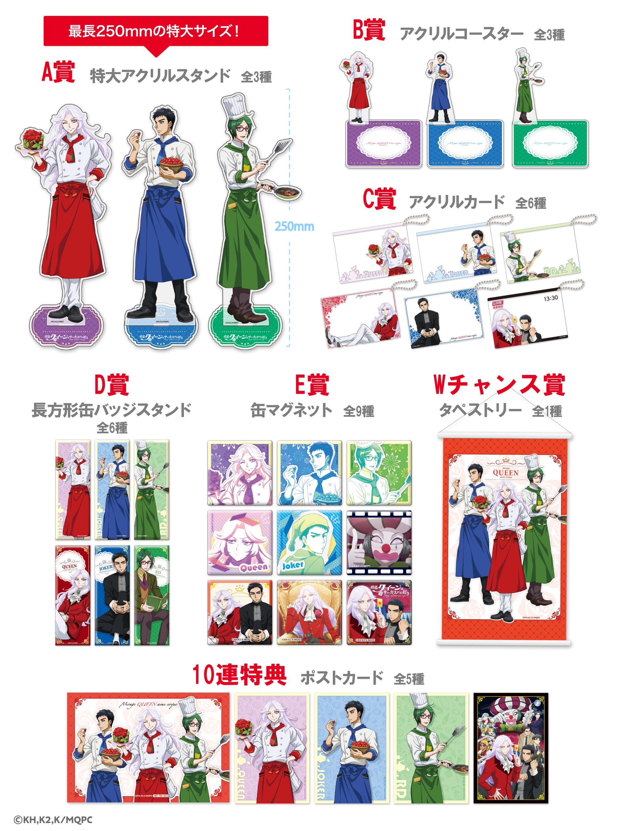 A賞では高さ約25cmの迫力ある「特大アクリルスタンド」、B賞「キャラ付アクリルコースター」、5名様に当たるWチャンス賞「A4タペストリー」など、ここでしか手に入らない限定アイテムばかりとなっております。