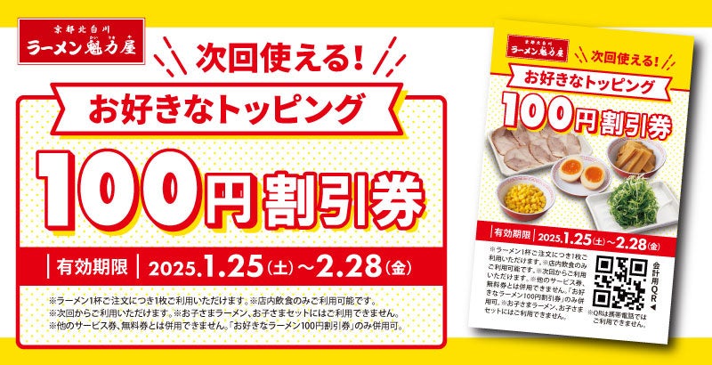 魁力屋よりお客様に日頃の感謝の気持ちを込めて、次回ご来店時よりご利用いただける「お好きなトッピング100円割引券」をプレゼントさせていただきます!