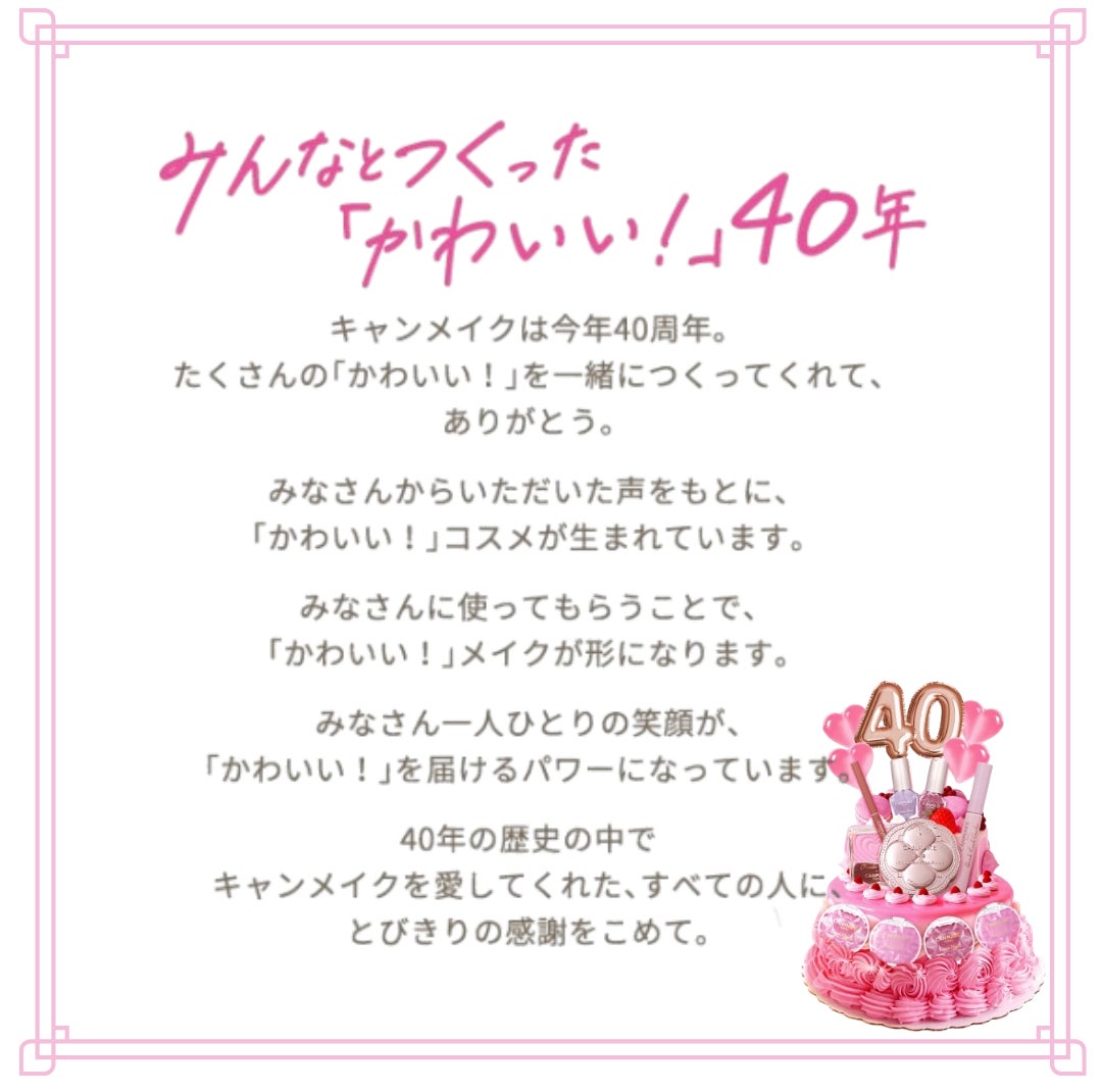 今年40周年を迎えたキャンメイクは、『みんなとつくった「かわいい!」40年』をテーマに掲げ、SNSキャンペーンや周年記念商品の発売、店頭イベント、ポップアップといったさまざまな企画を年間を通して展開しています。