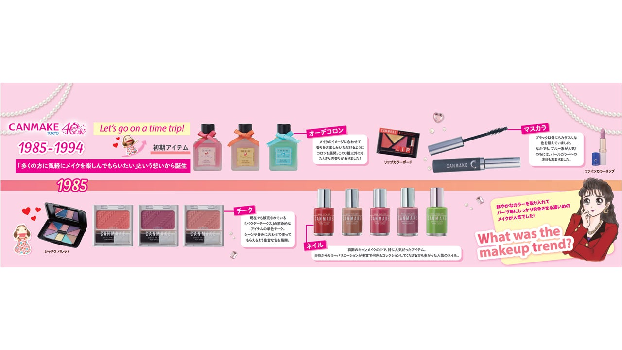 1985年(昭和60年)から現在にいたるまで、キャンメイクから発売した歴代アイテムをエピソードと共にご紹介しています。