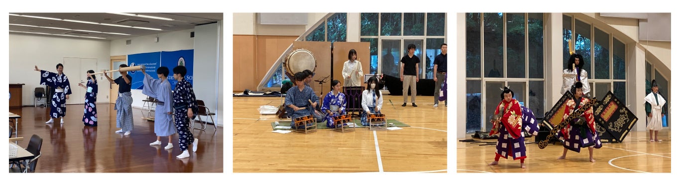 本校の英語歌舞伎の取り組みは今年1月より始まりました。生徒たちは歌舞伎の歴史・衣装・楽器などについて調べ学習を行いながら理解を深め、4月からは役割分担を行い、お稽古や制作など準備を重ねています。演者となる生徒は、中村壱太郎さんをはじめとする歌舞伎俳優の方々から浴衣の着方や立ち回り、セリフの発し方などを学び、動きや表現を身につけています。8月からは本格的に「英語」での演技の練習を開始いたしました。