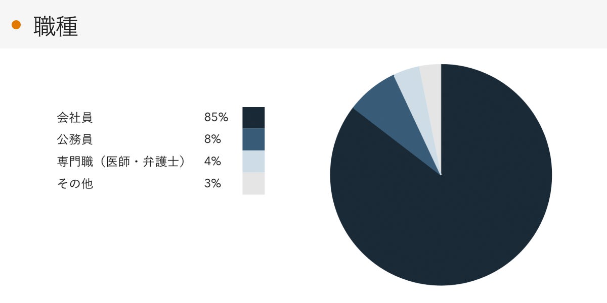 成約顧客の職種は、会社員が85%、続いて公務員の8%、専門職(医師・弁護士)4%、その他3%となっています。