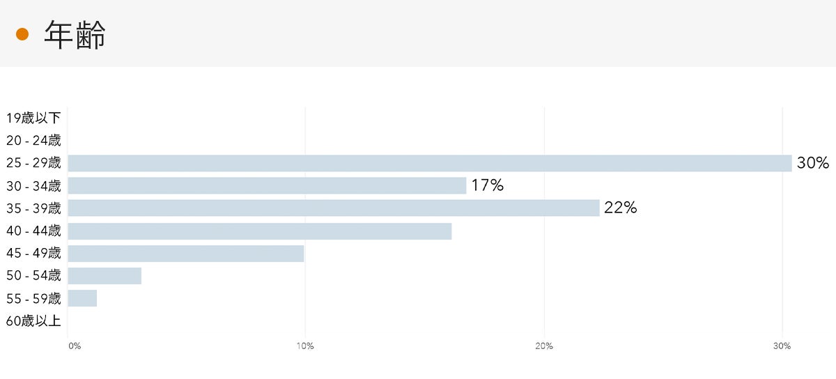 最も割合の多い年齢帯は25〜29歳で30%、次に多い割合は35〜39歳の22%、続いて30〜34歳で17%と続きます。