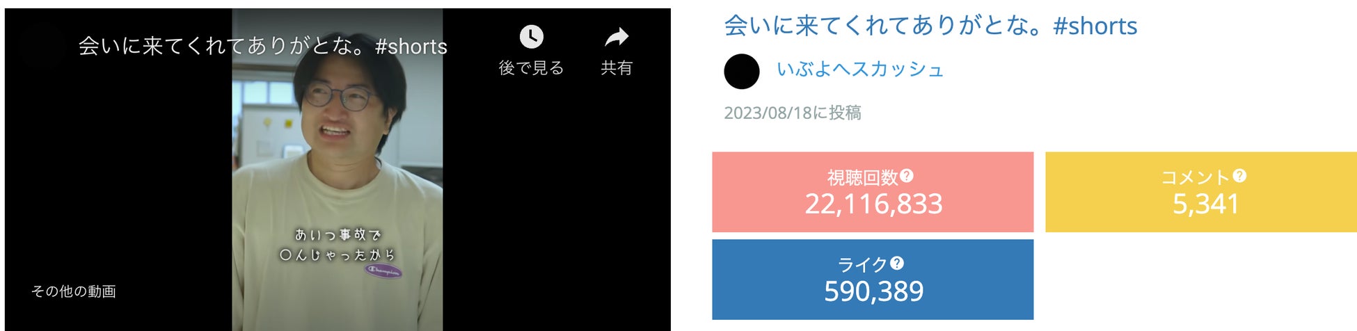 2023年8月に投稿されたショート動画「会いに来てくれてありがとな。#shorts」は、視聴回数が2,200万回(2024年5月現在)を超え、5,000件以上のコメントが寄せられるという驚異的な反響を呼びました。この結果は、「いぶよへスカッシュ」が多くの視聴者に愛され、バズるコンテンツを生み出し続けている証と言えるでしょう。